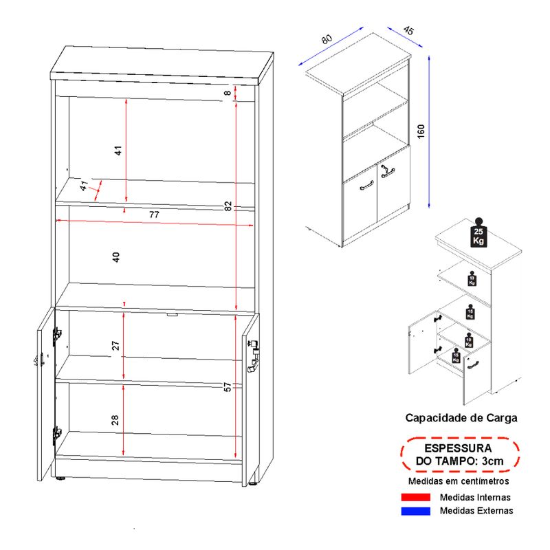 Dimensões: 80 cm de Comprimento, 45 cm de Largura e 160 cm de Altura.