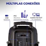 - Conexões USB/AUX/MIC/GUITAR: Entradas para conectar Microfone, Pen Drive, MP3, MP4 e instrumentos musicais.